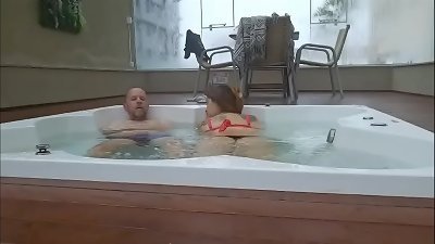 Ginger Haired在汽车旅馆遇到了一位客人,并邀请他去按摩浴缸,她的丈夫甚至没有注意到